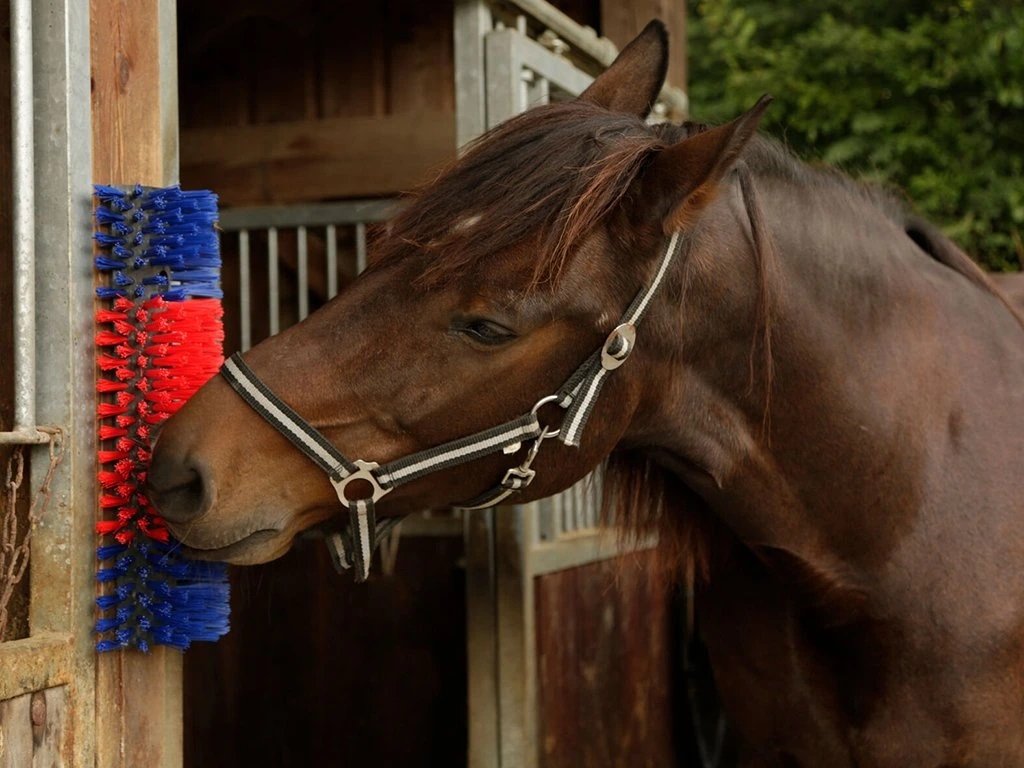 Kartáčové drbadlo, pro koně a skot, na stěny, rohy a sloupky, zejména na kartáčování hlavy a krku, polyamidové 5 cm štětiny, rozměry 22x50x9 cm.